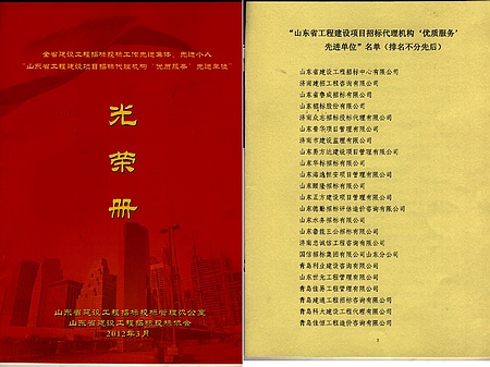 山東省建設(shè)項(xiàng)目招標(biāo)投標(biāo)代理機(jī)構(gòu)優(yōu)秀服務(wù)先進(jìn)單位